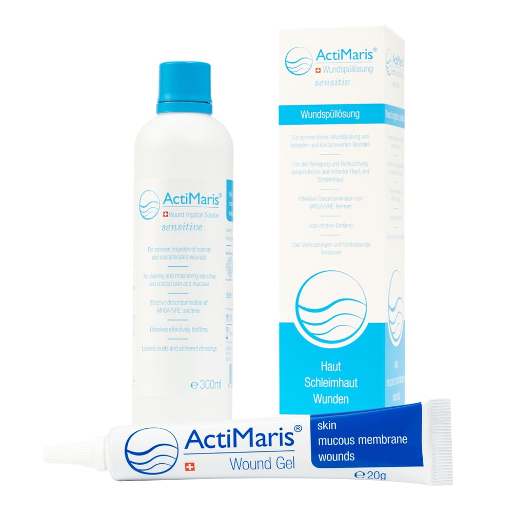 ActiMaris sensitiv raztopina za čiščenje ran zagotavlja neboleče izpiranje obloženih in okuženih ran. Izredno učinkovita je za čiščenje in vlaženje občutljive in razdražene kože in sluznice, za učinkovito razkuževanje (MRSA, VRE), mehča kraste in obloge, ki so sprijete z rano.